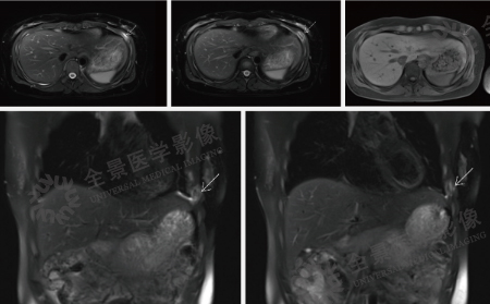 案例:中年女性,纳差,腹胀3周,否认乙肝病史,外院CT示:肝内低密度灶,腹盆腔大量积液。左肾囊肿。肝脏轮廓光整,肝左右叶比例正常,肝左叶外侧段见类楠圆形囊状水样信号灶,长径约20mm,增强扫描未见强化。肝内未见异常强化灶。肝内血管走行正常,肝内、外胆管未见扩张。下腔静脉肝段呈扁线状改变。胆囊大小正常,壁未见增厚,囊内未见异常信号。脾脏增大,信号未见异常,增强未见异常强化。胰腺形态、大小正常,信号均匀,增强未见异常强化,胰管未见扩张。双侧肾脏大小、位置、形态正常,双肾实质内见数枚囊状水样信号灶,大者位于左肾,长径约21mm。双侧肾上腺形态及信号未见异常。全腹大量腹水,包括网膜囊下隐窝大量腹水,腹膜后未见肿大的淋巴结。