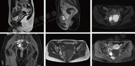 案例:中年女性,体检超声发现右侧卵巢囊肿3年余,无自觉不适,月经周期及量均无异常;4个月前复查超声示子宫右后方囊实性肿块,考虑恶性肿瘤可能。MRI表现:子宫右后侧见一囊实性肿块,大小约76mm×62mm,内见分隔及囊壁结节,增强后扫描囊壁及壁结节强化,囊内并见强化的乳头状突起。