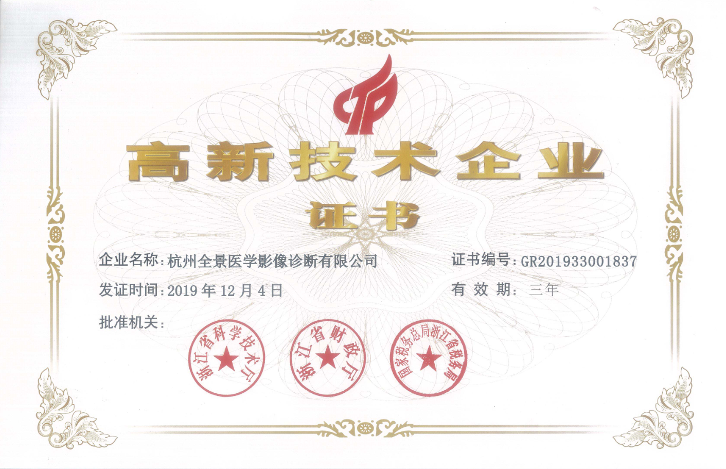 继全景医学影像上海徐汇中心2017年荣获“高新技术企业”荣誉称号之后,近日,全景杭州中心、广州中心也相继荣获由科技部、财政局、国家税务总局联合批准颁发的 “高新技术企业”荣誉称号。