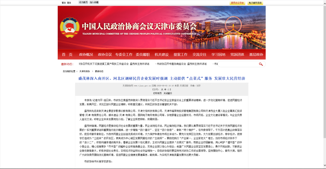 盛茂林深入南开区、河北区调研民营企业发展,强调 主动提供“点菜式”服务 发展壮大民营经济。(点击查看原文)
