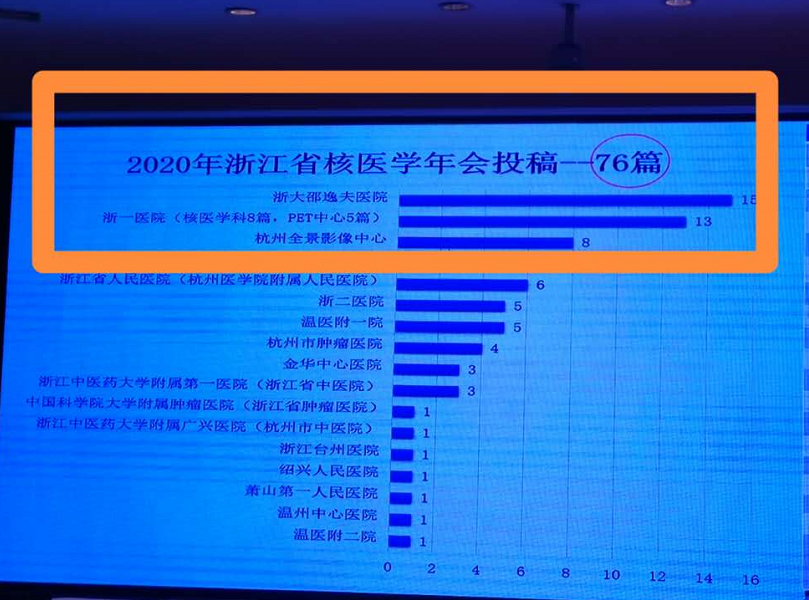 浙江省医学会核医学分会主委楼岑教授在会上就浙江省核医学学科建设的情况做了分享。其中,本次浙江省核医学年会的公开征稿,共计投稿76篇,杭州全景医学影像诊断中心医生投稿8篇,投稿量居2020浙江省核医学年会投稿第三名,充分展示了全景医学影像在临床检查及科研创新方面取得的成果。