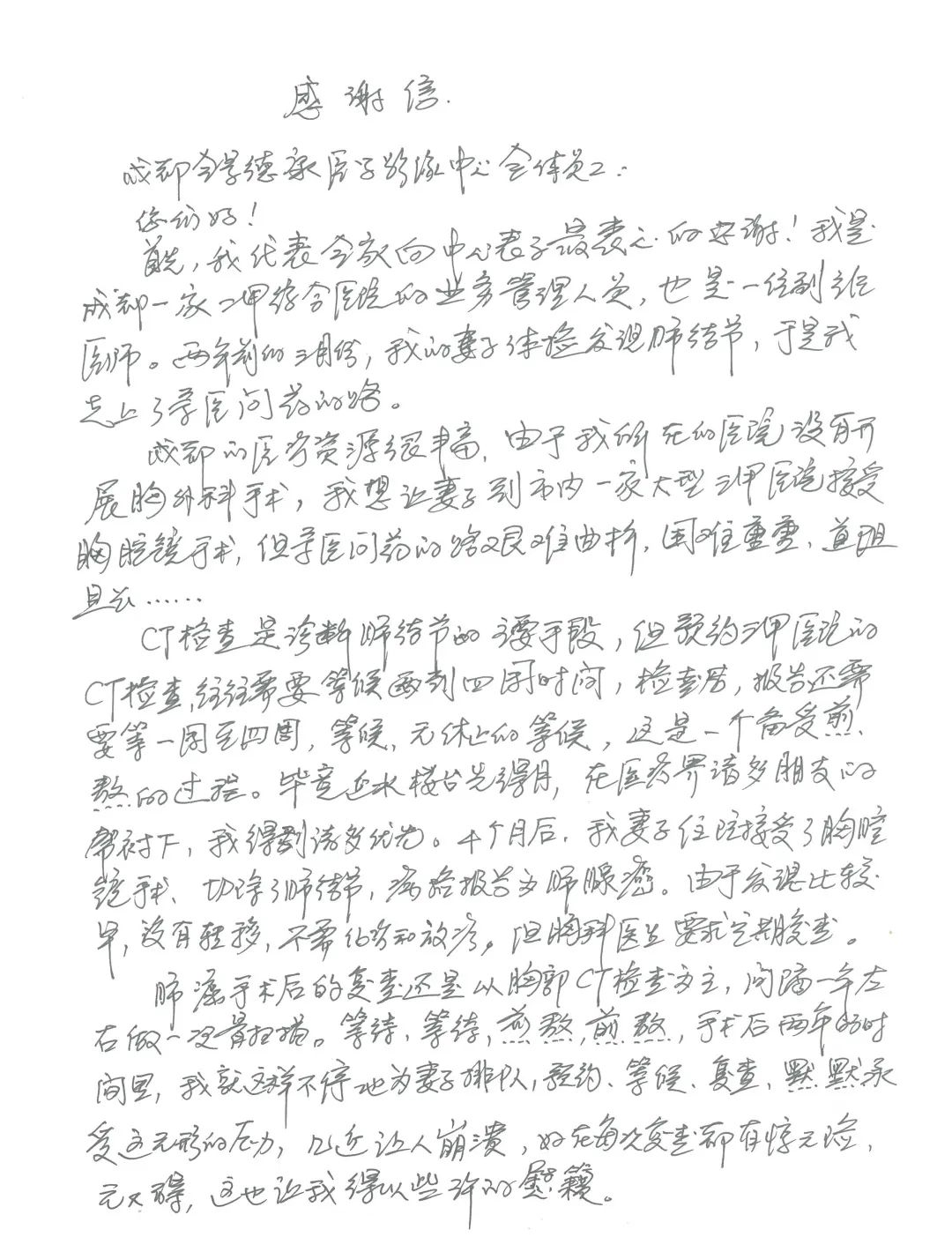 为了表达我的感激之情,谨以此信,向成都全景医学影像诊断表示感谢,同时,也希望你们能越办越好,方便更多患者。