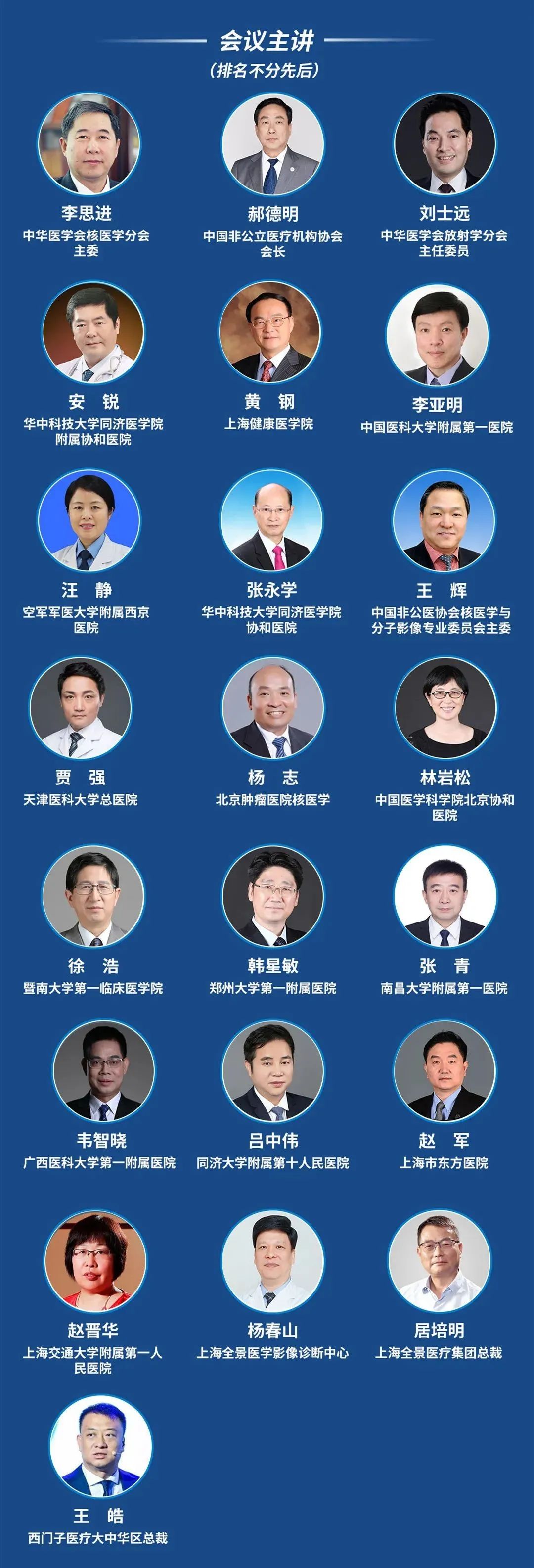暨南大学临床医学研究院副院长徐浩教授、郑州大学第一附属医院核医学科主任韩星敏教授、南昌大学附属第一医院核医学科主任张青教授、广西医科大学第一附属医院核医学科主任韦智晓教授、同济大学附属第十人民医院副院长&核医学科主任吕中伟教授、上海市东方医院核医学科主任赵军教授、上海交通大学附属第一人民医院核医学科主任赵晋华教授、上海全景医学影像诊断中心院长张建教授、名誉院长杨春山教授、