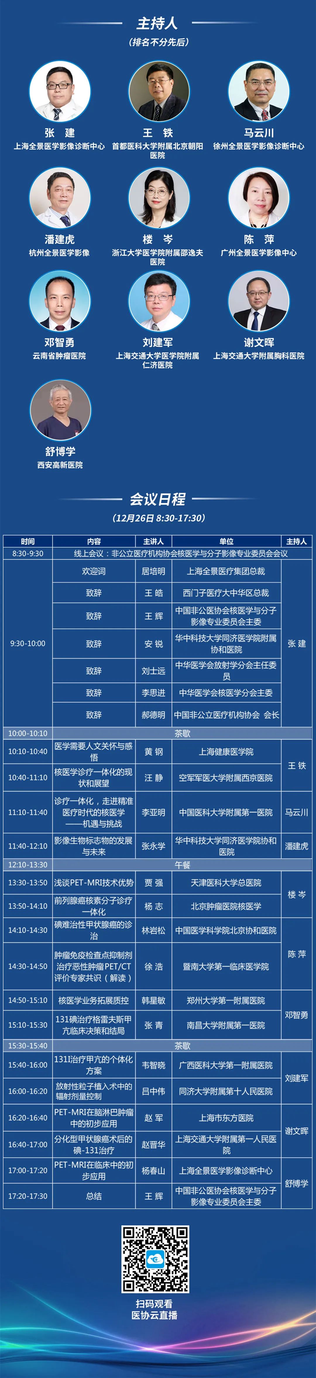 首都医科大学附属北京朝阳医院核医学科主任王铁教授、徐州全景医学影像诊断中心核医学科主任马云川教授、杭州全景医学影像诊断中心院长潘建虎教授、浙江大学医学院附属邵逸夫医院核医学科主任楼岑教授、广州全景医学影像诊断中心院长陈萍教授、云南省肿瘤医院核医学科主任邓智勇教授、上海交通大学附属仁济医院核医学科主任刘建军教授、上海交通大学附属胸科医院核医学科主任谢文晖教授、西安高新医院副院长&核医学科主任舒博学教授。