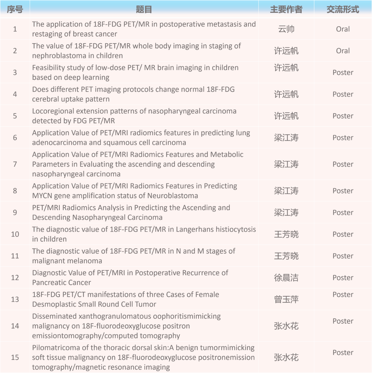 此次SNMMI会议接收的15篇研究成果列于上表,主要涉及到: