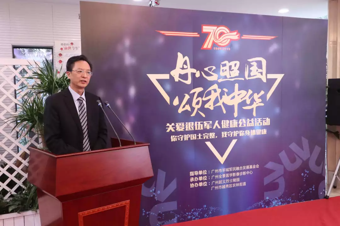 广州全景医学影像诊断中心院长周智洋教授发表欢迎致辞,表示很荣幸承办本次活动,对出席今日启动仪式的各机构单位的同志和退役军人代表表示欢迎。周智洋院长现场讲述了自身做为烈士家属的荣誉感和使命感,感谢军人们为家国做出的贡献,爱国拥军,人人有责!借用此次活动对军人说“你守护国土完整,我守护你身体健康”。