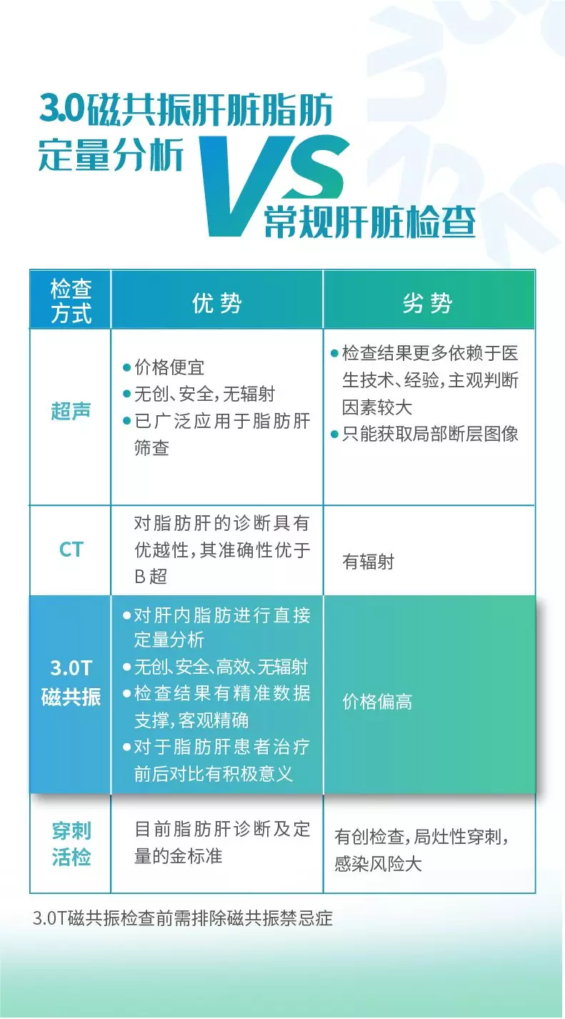 通过比较,我们可以看到,目前能对肝内脂肪进行直接定量分析的检查方式是通过3.0T磁共振实现的。