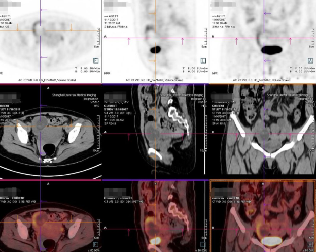 全景PET/CT诊断组李医生在开始为她进行阅片中发现其右侧附件区长了一个长径约8cm的囊实性奇怪病灶,病灶呈椭圆形,与脑海中浮现的所有附件常见病灶都不太相像。