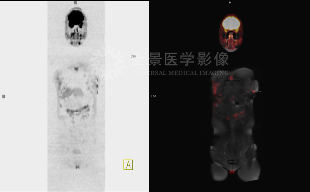 检查提示,左乳外下象限发现一类圆形病灶,WB-DWI呈高信号。