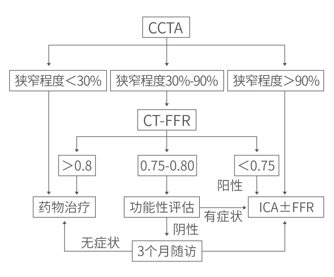 3.冠状动脉CTA提示有交界性中重度狭窄,需进一步行功能评估者。