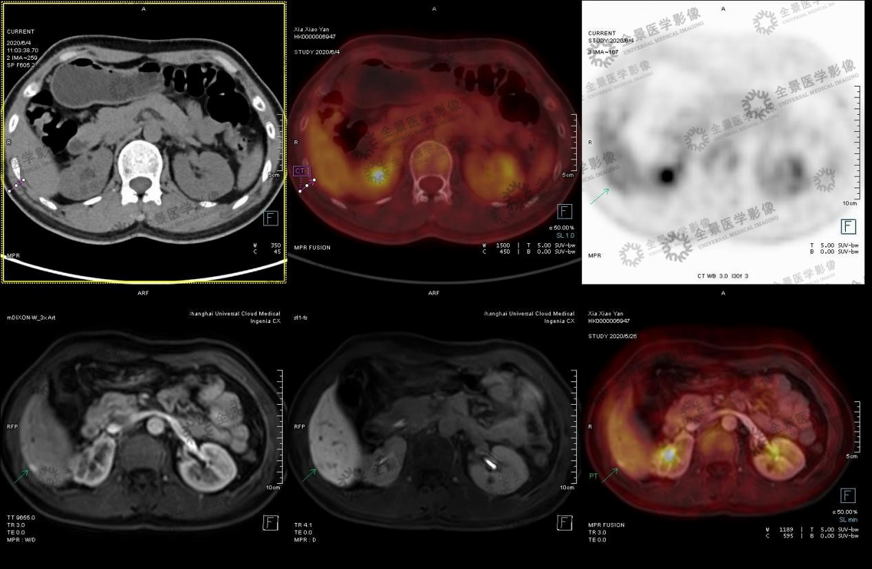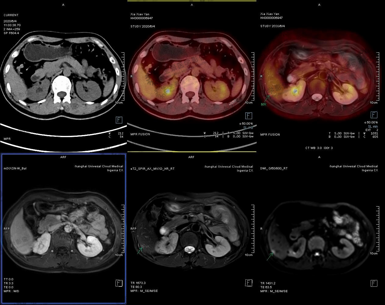 中年女性 外院体检发现肝脏小结节,乙肝病史不详。无明显不适症状。2020.5 于本中心行腹部MRI示:肝右后叶下段包膜下小结节,考虑小肝癌可能。