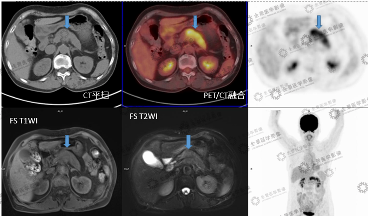 胰腺癌中导管细胞癌是最主要的病理类型,约占90%。典型的影像表现为乏血供,无包膜,易侵犯神经和神经周围淋巴管。MR增强可以明确显示出病灶的血供情况以及周围组织的侵犯情况。胰腺癌的淋巴及血行转移较早,PET/CT检查多数表现为高代谢,对远处转移的检出有帮助。