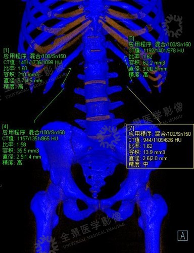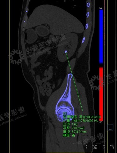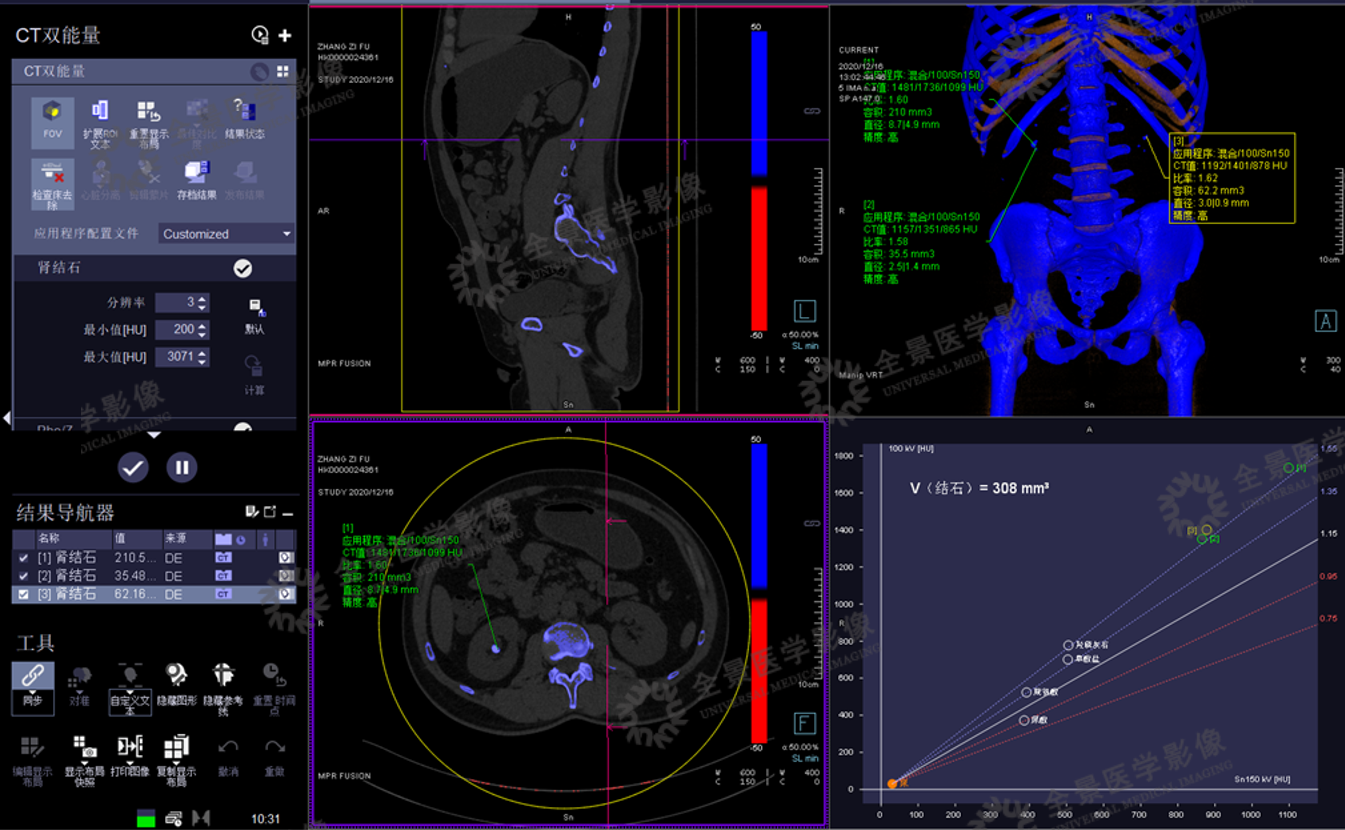 后处理结果会显示肾结石的一些参数,如高低能量下的CT值,比率,结石的体积,直径以及评估的精度: