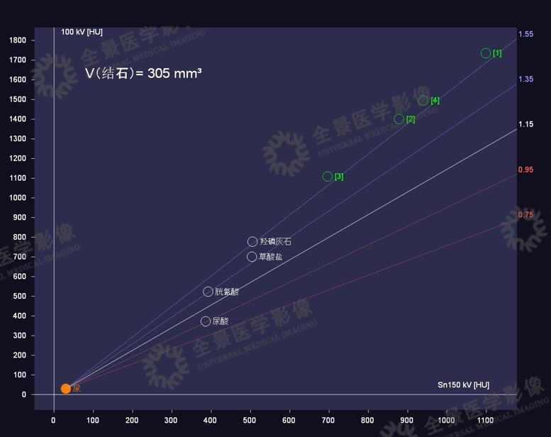 双能量结石成分分析为双肾多发羟磷灰石成分结石,非尿酸结石。