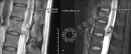 √MR显示病灶与脊髓的关系,压脂序列呈低信号;