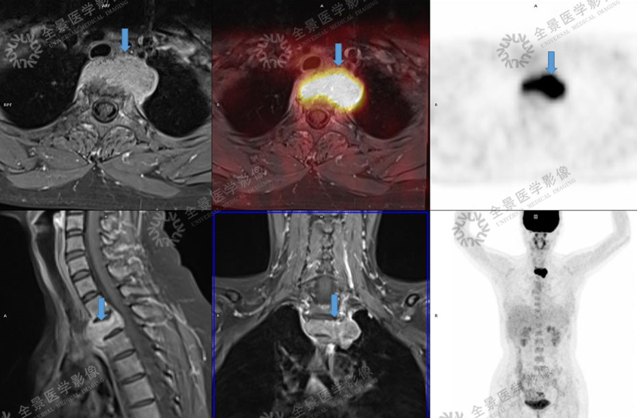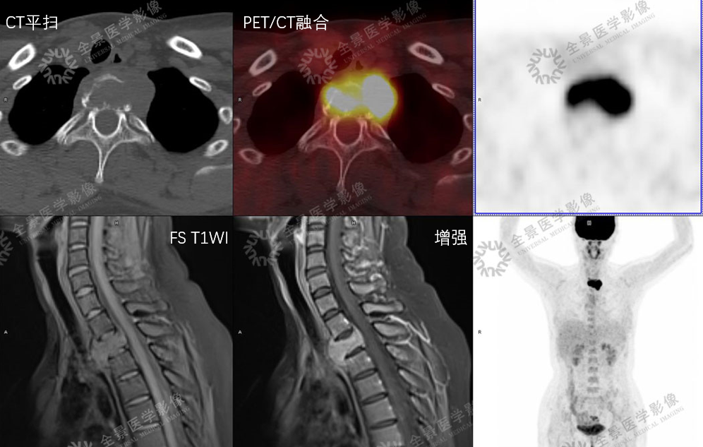 T2WI不均匀等信号,PET/CT显示:软组织肿块,FDG明显摄取增高。