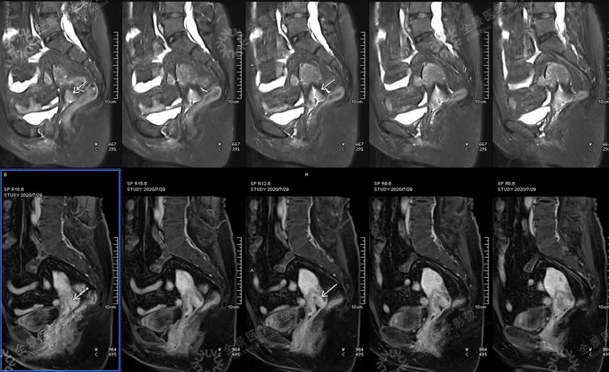 病灶向上累及子宫峡部,向下累及阴道穹隆及相邻阴道壁,宫颈周围脂肪间隙清晰。
