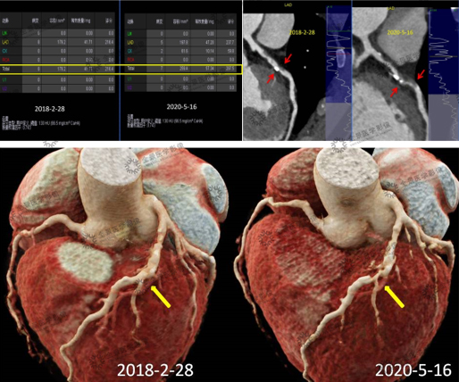 MPR图像,黄色及红色箭头处,提示LAD近段的混合密度板块内的软斑块成分(不稳定成分增加)及钙化成分,无论从体积上,还是从病变长度上均有所增长,管腔壁变得更加毛糙不规则,管腔狭窄程度由中度变成重度,高度提示需要进一步DSA检查明确及治疗。