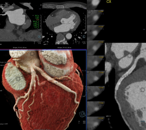 男,54岁,冠心病PCI术后,原始图像结合二维MPR及三维CVRT图像清晰显示,左回旋支CX近中段支架壁光滑、形态正常,支架通畅。